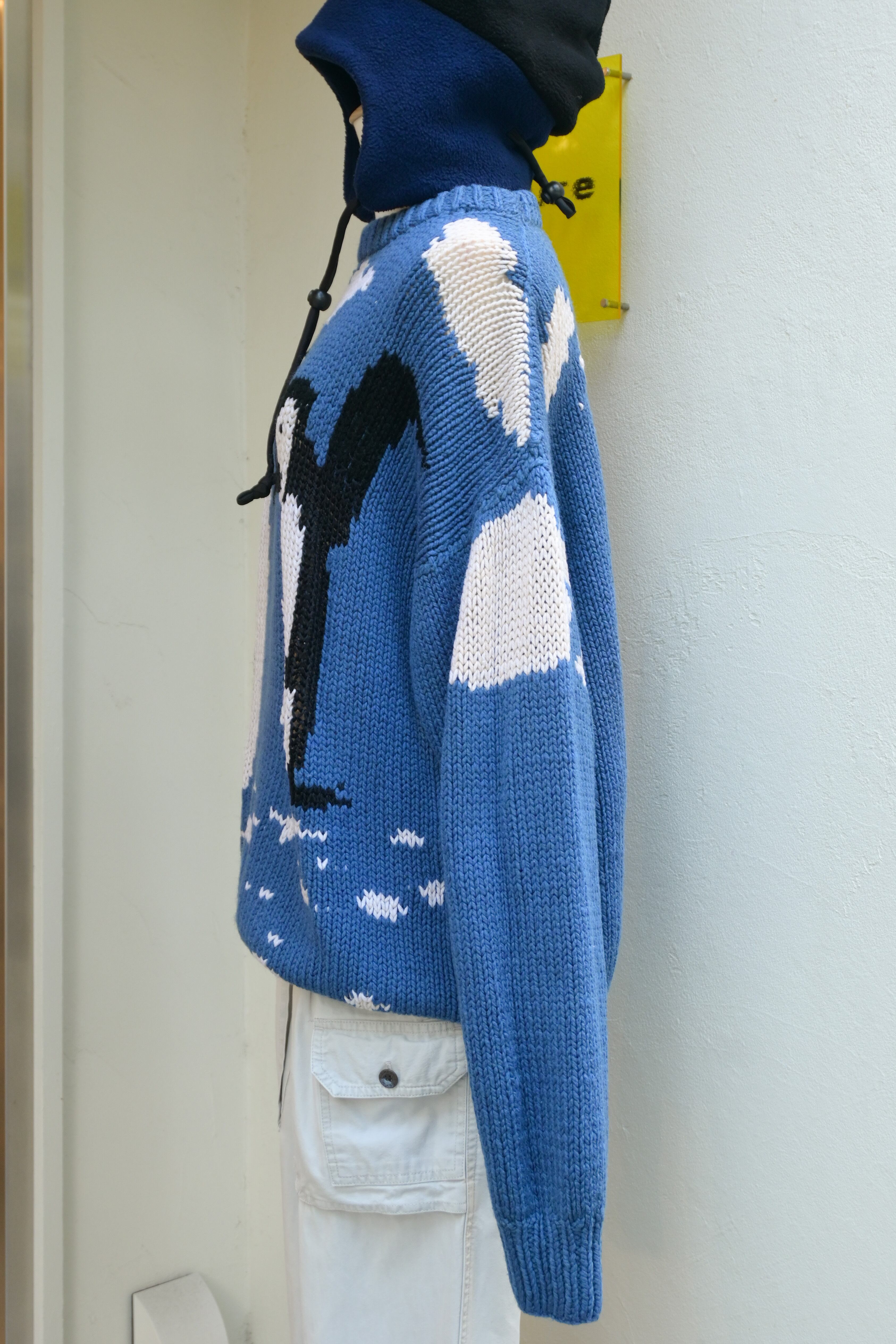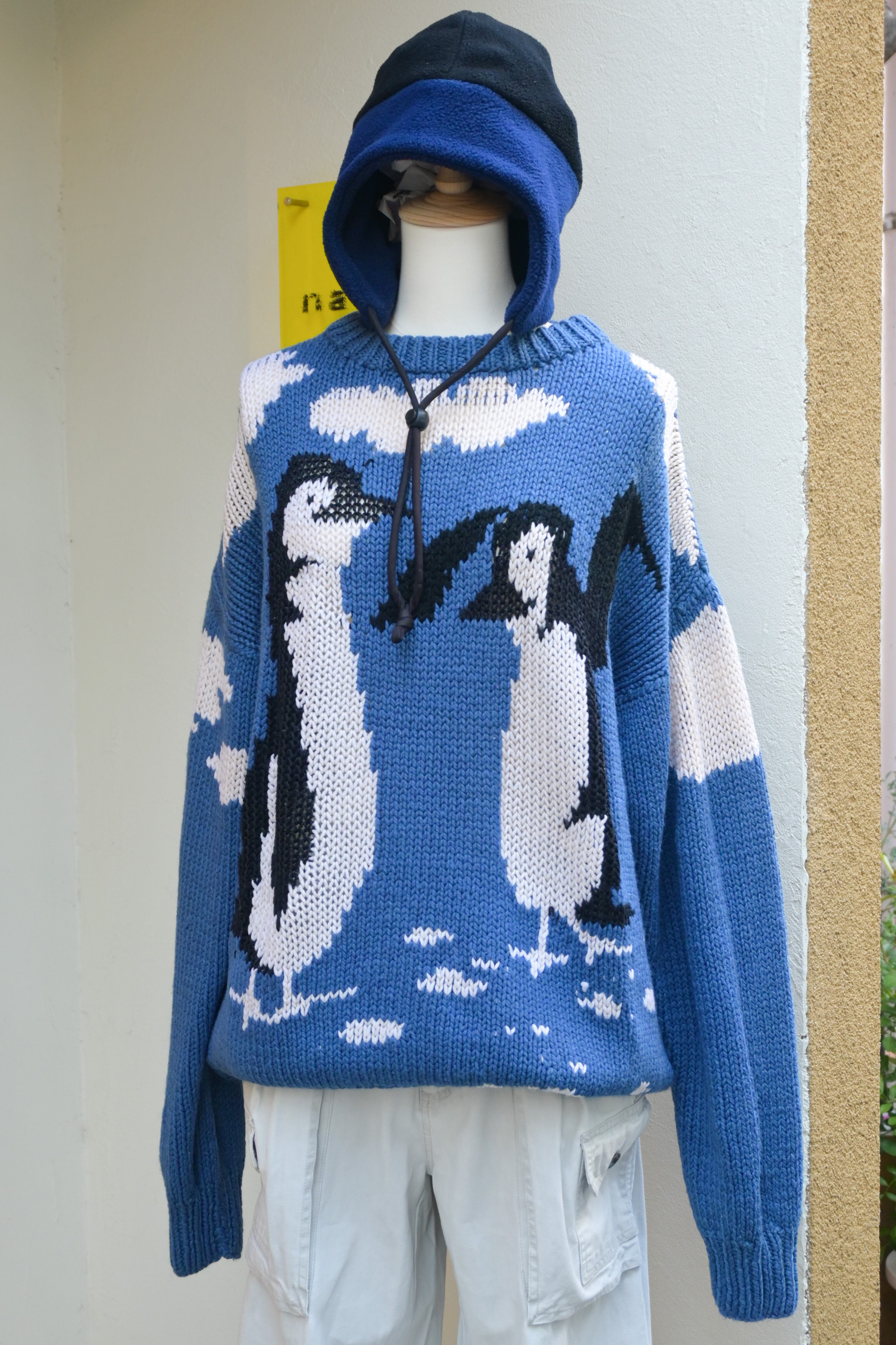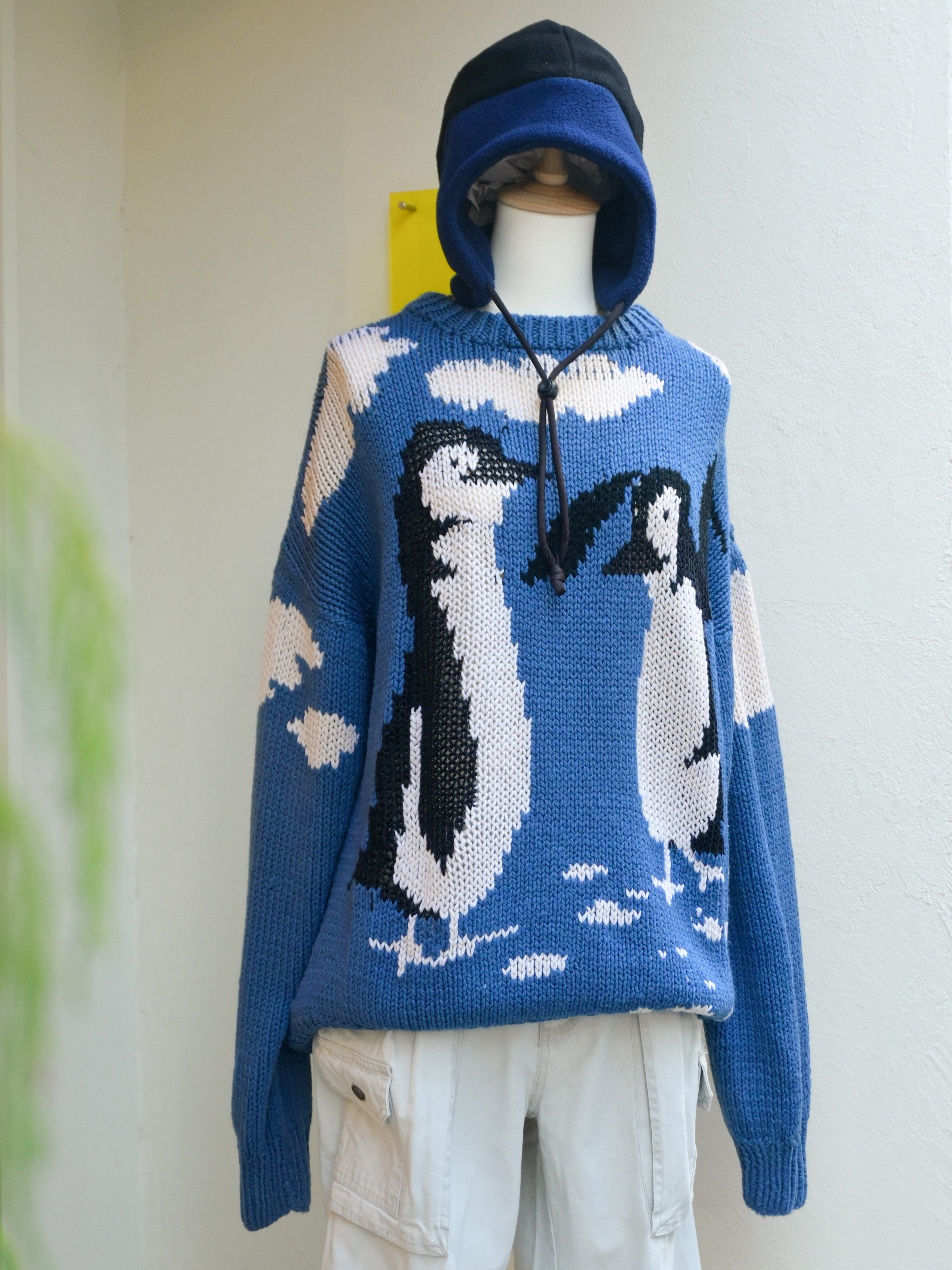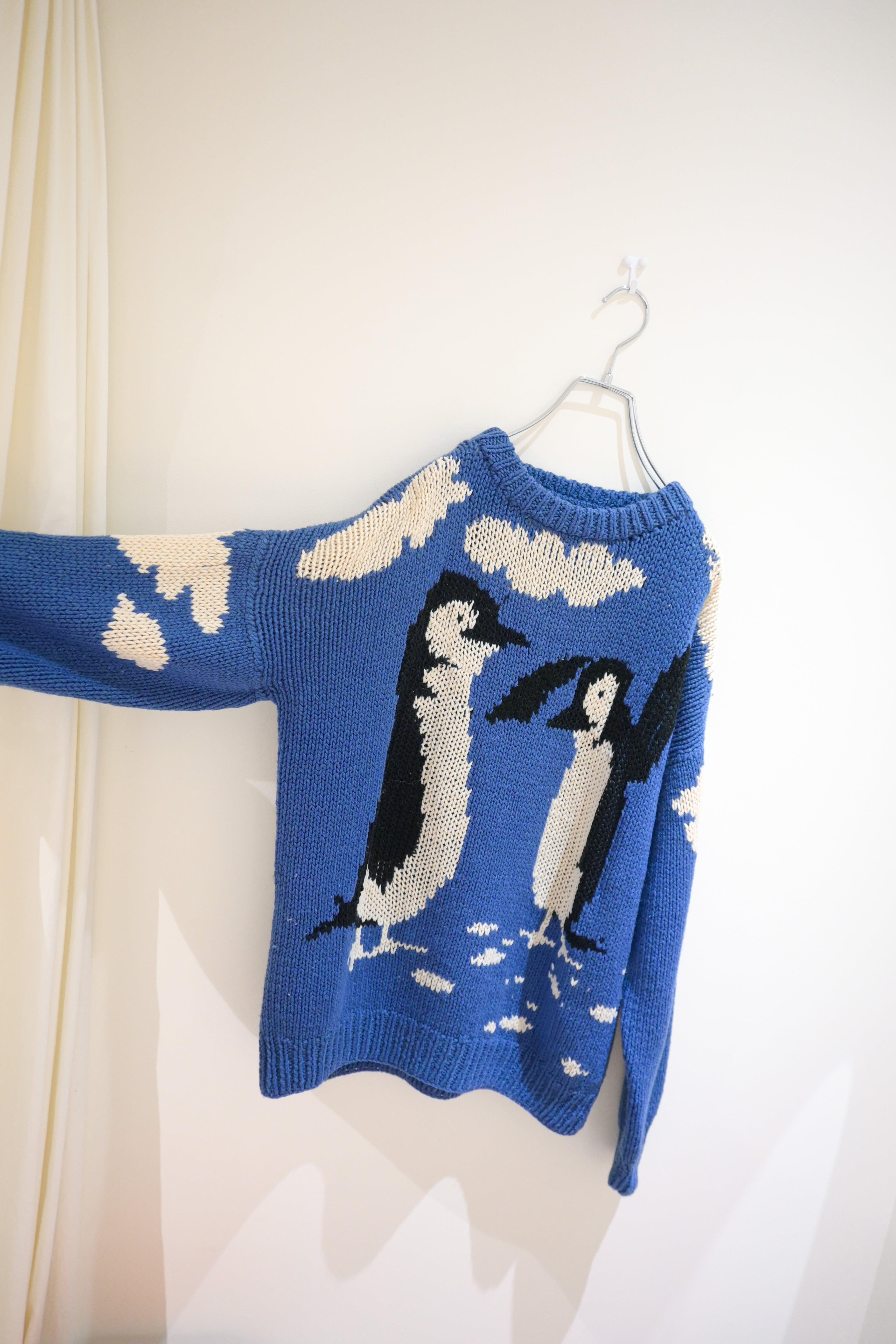Hand knitted penguins and blue sky sweater
