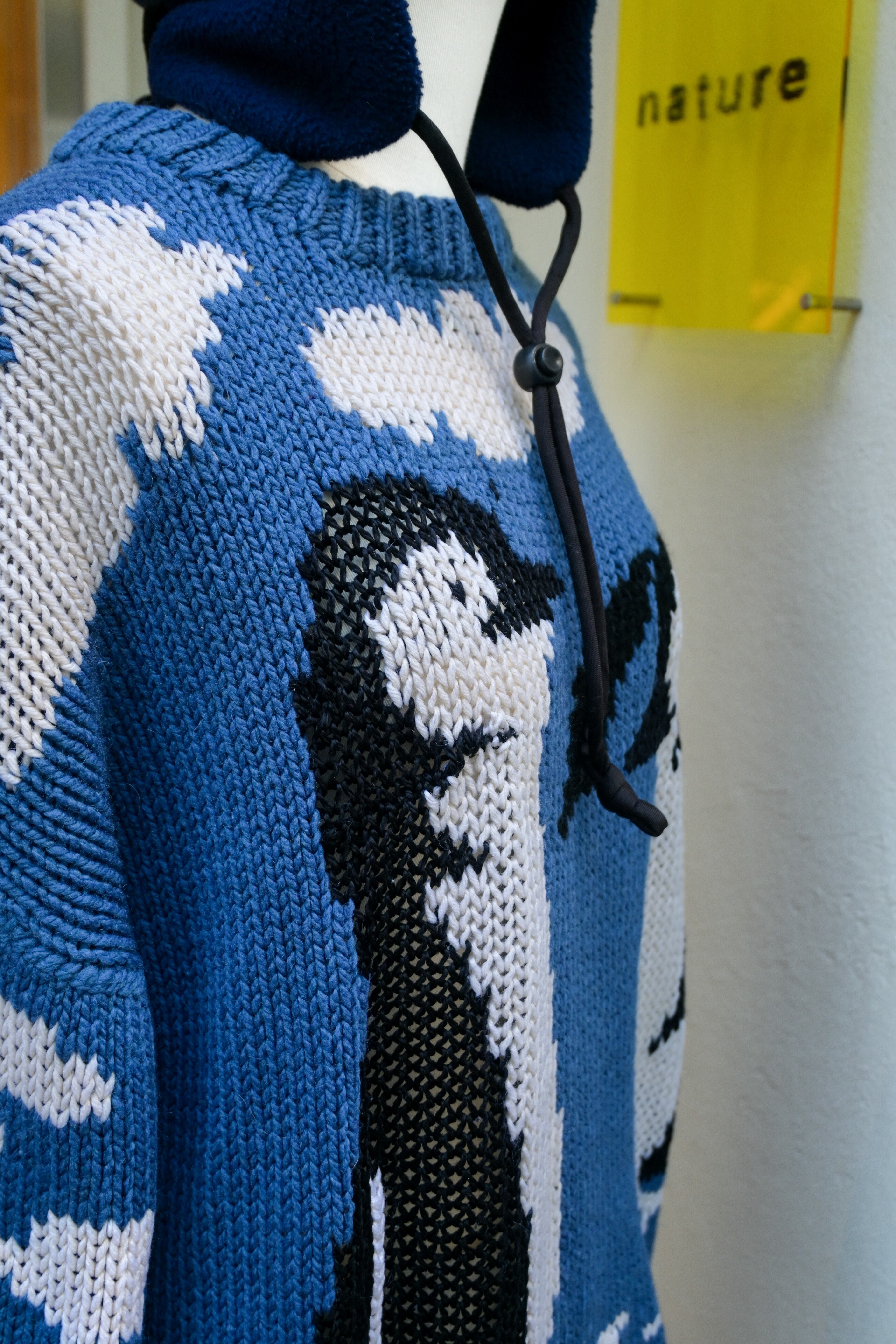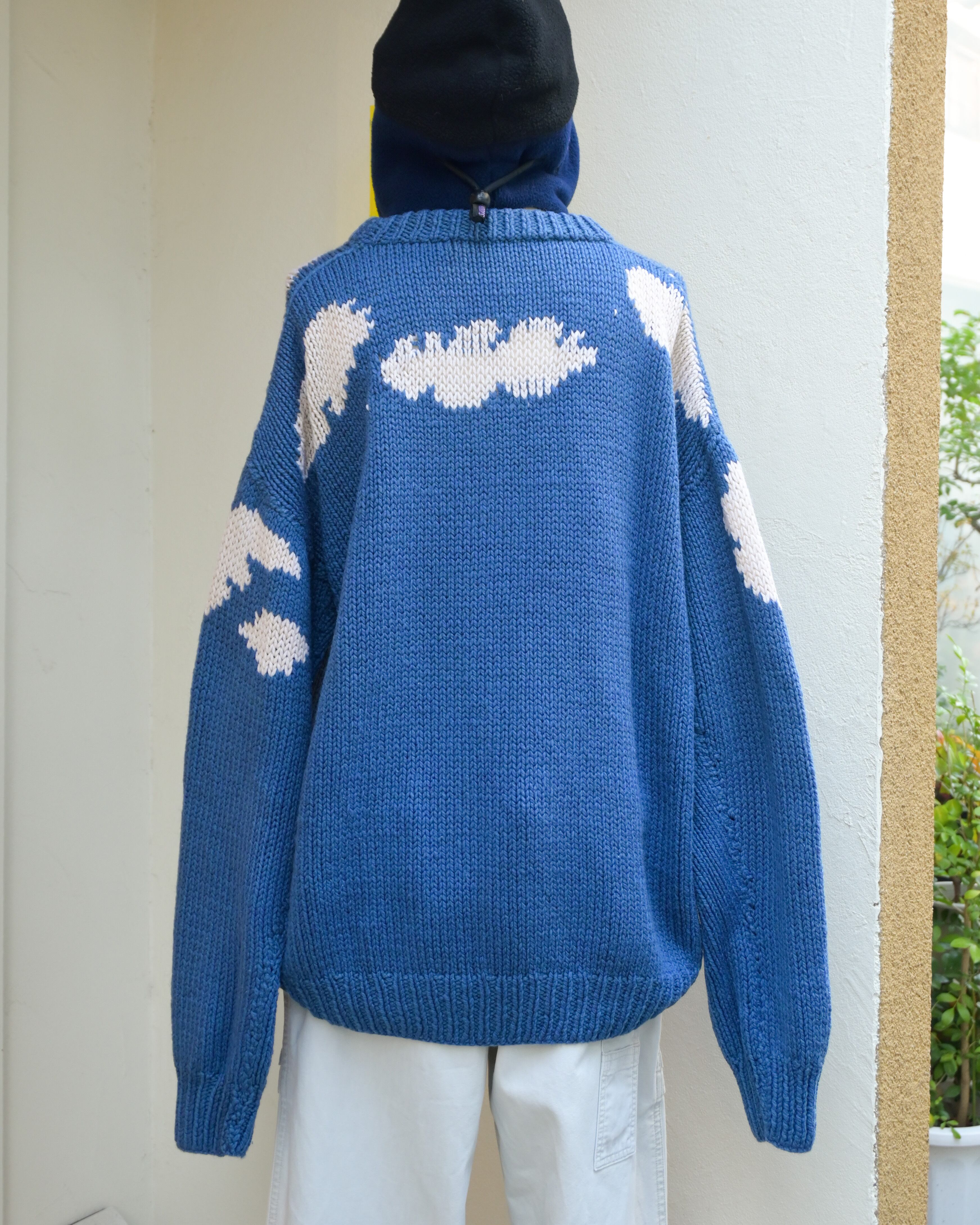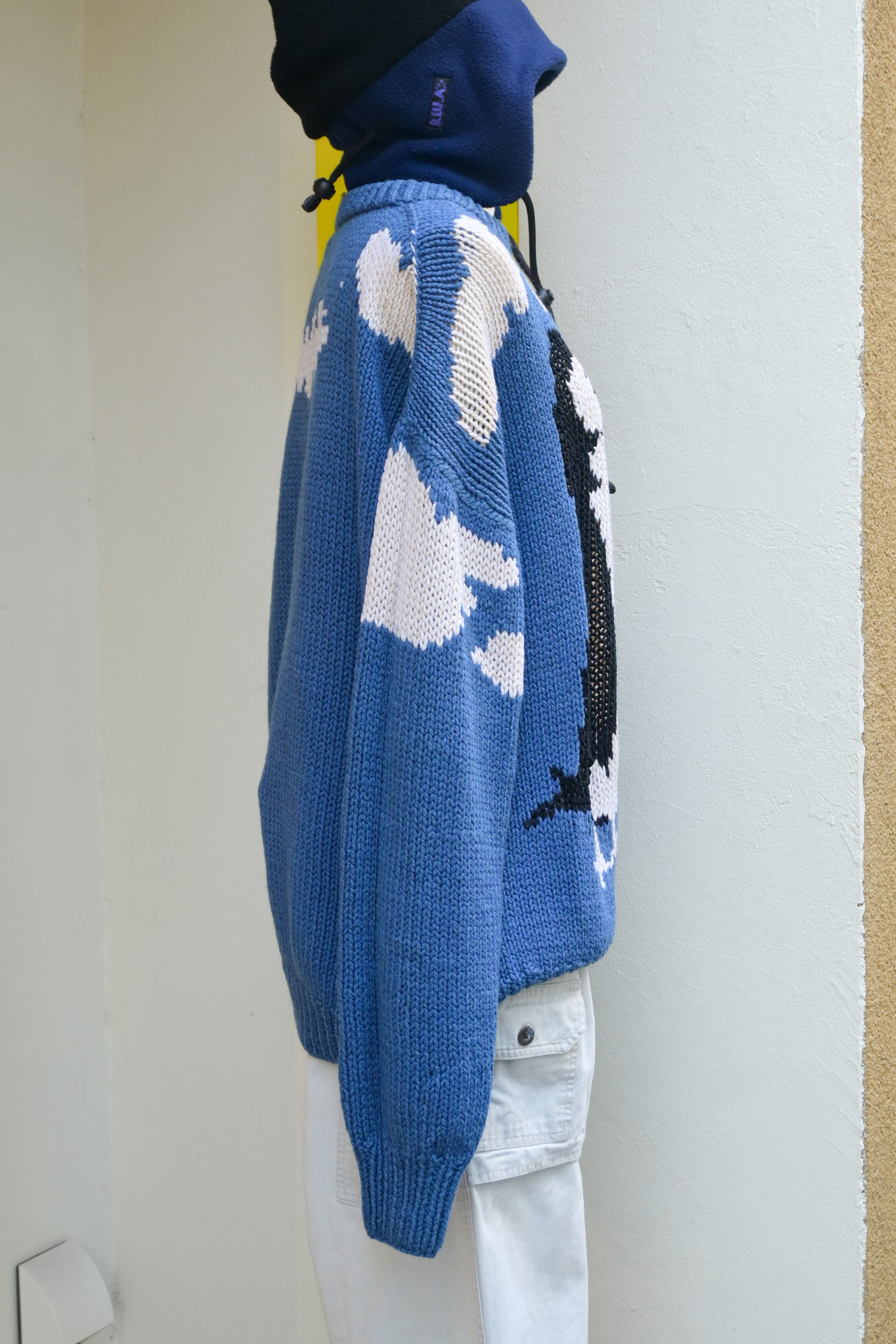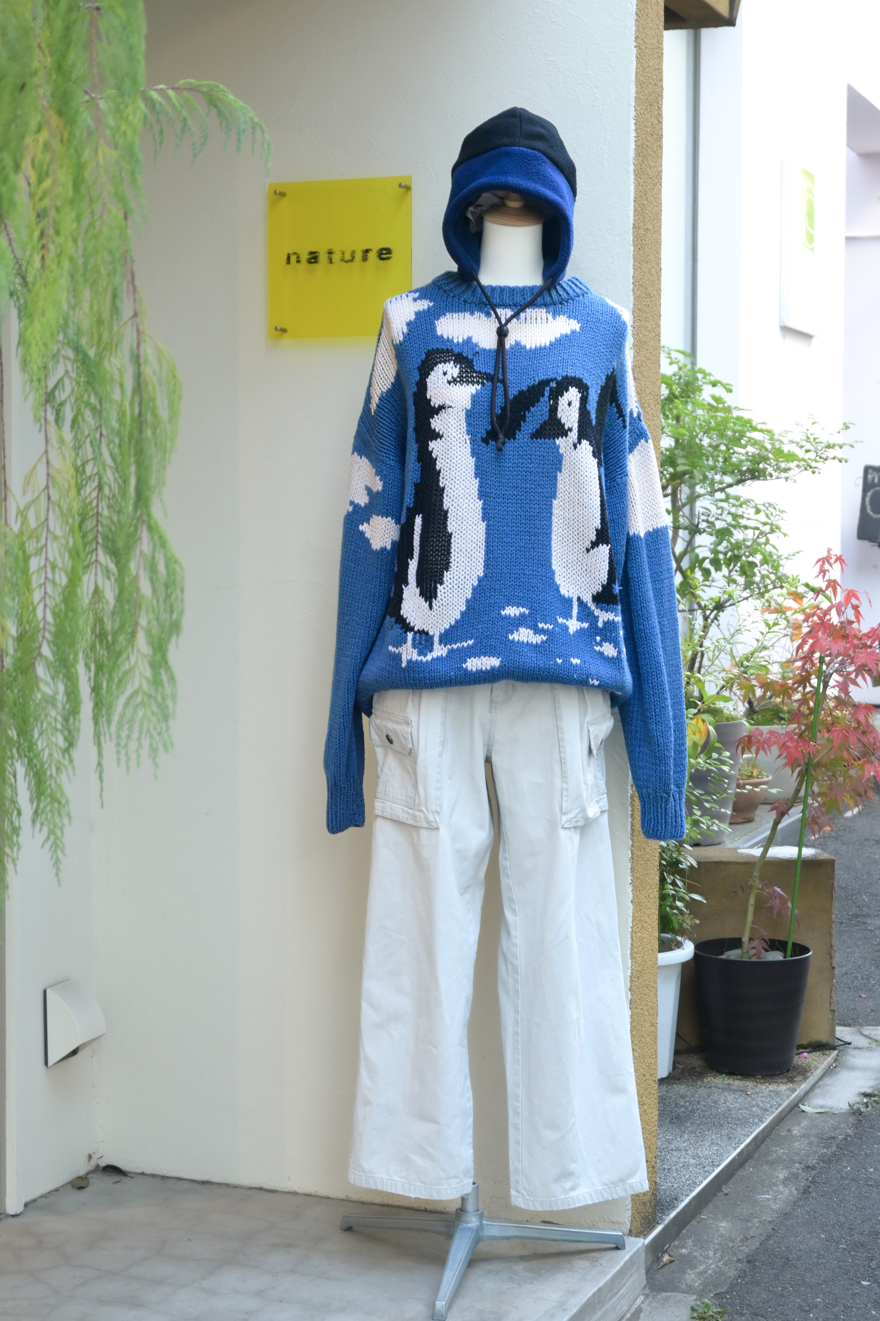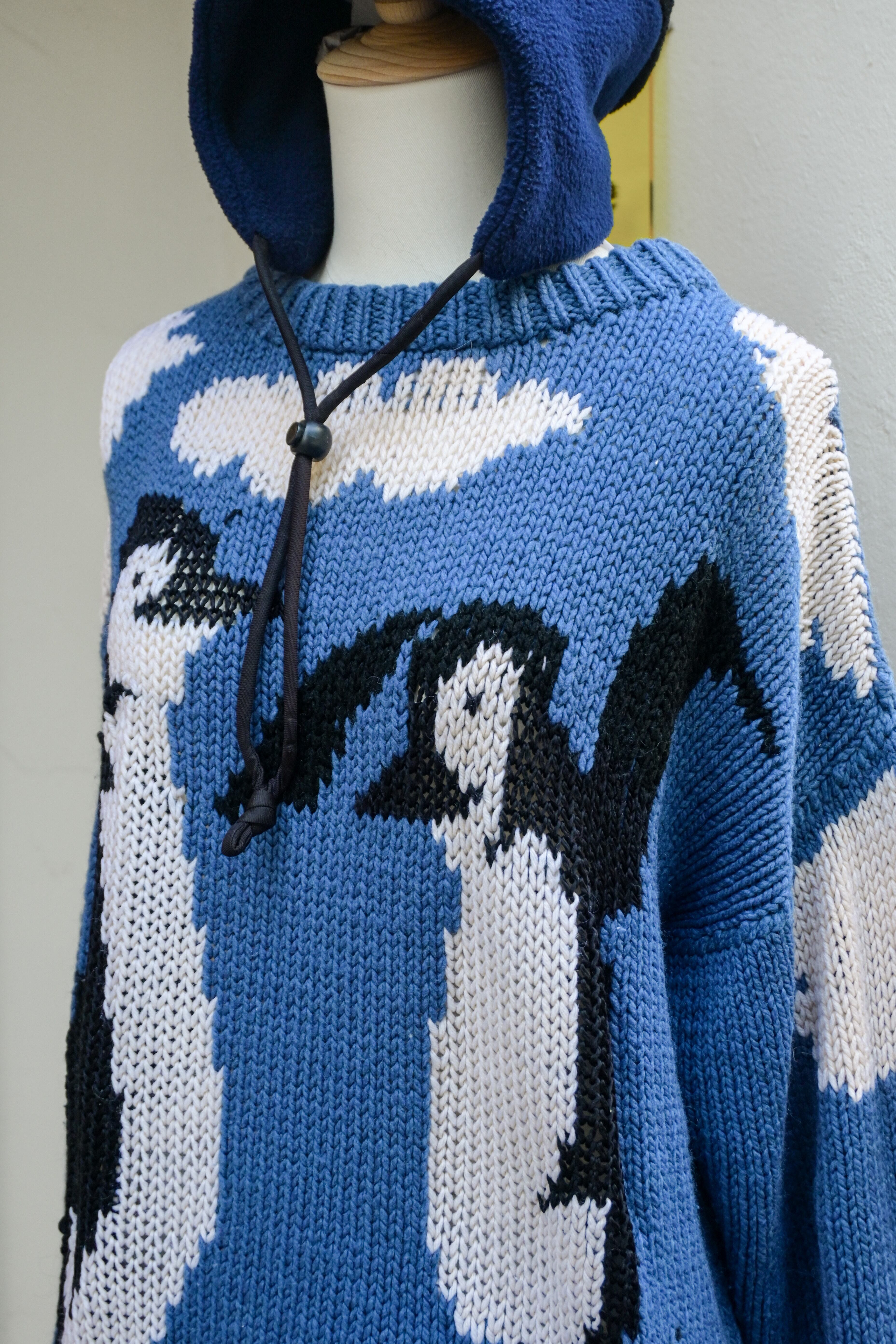 Hand knitted penguins and blue sky sweater