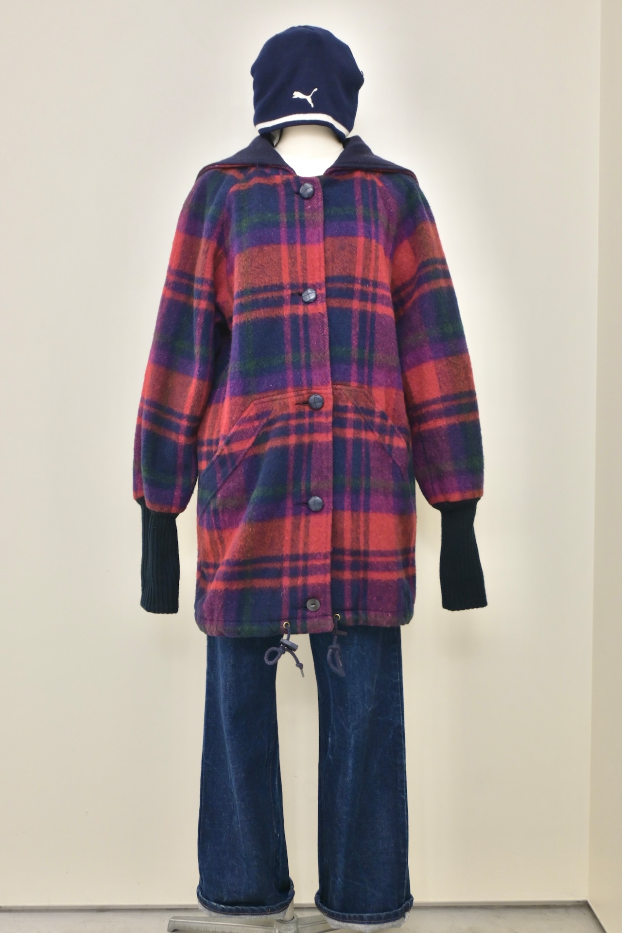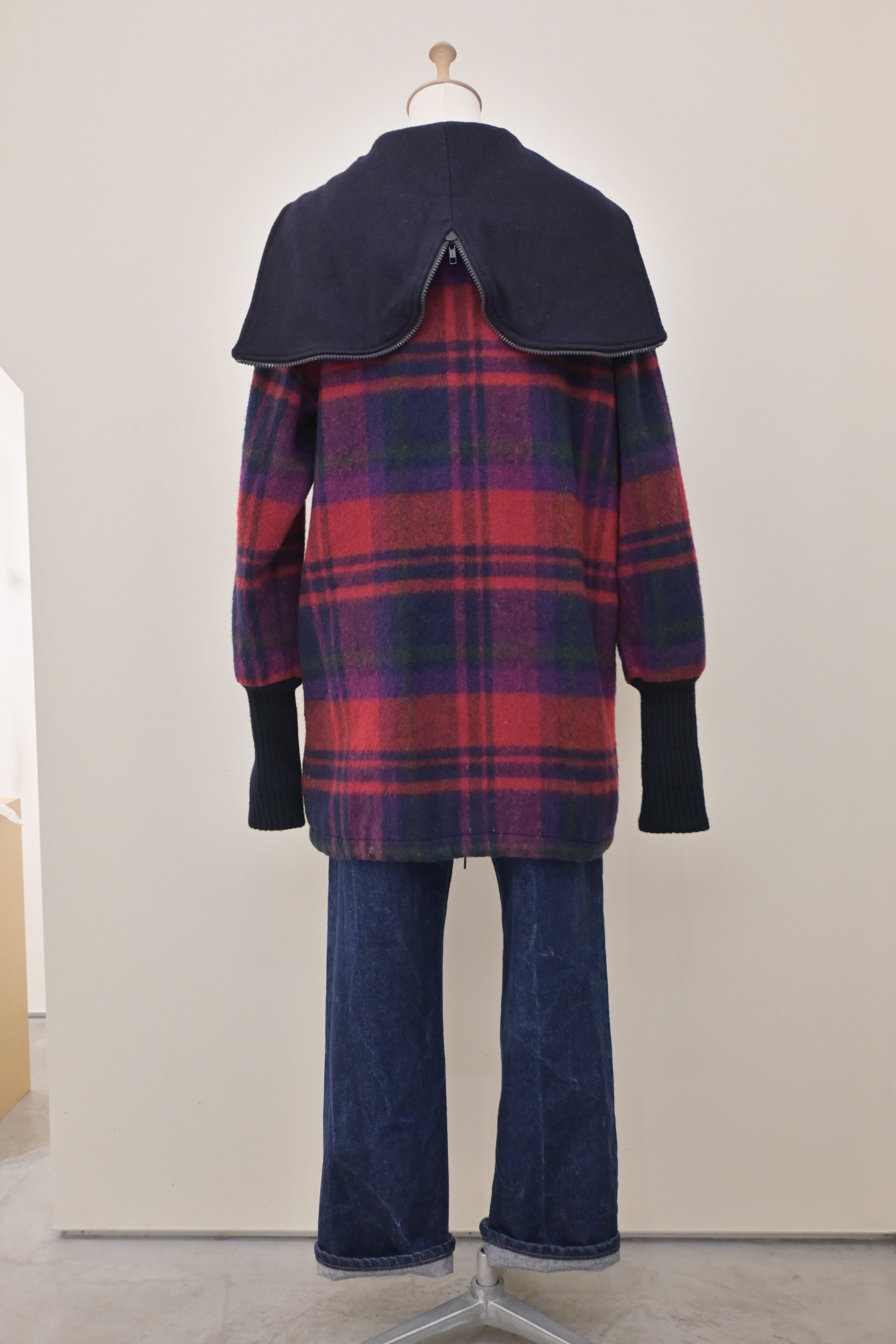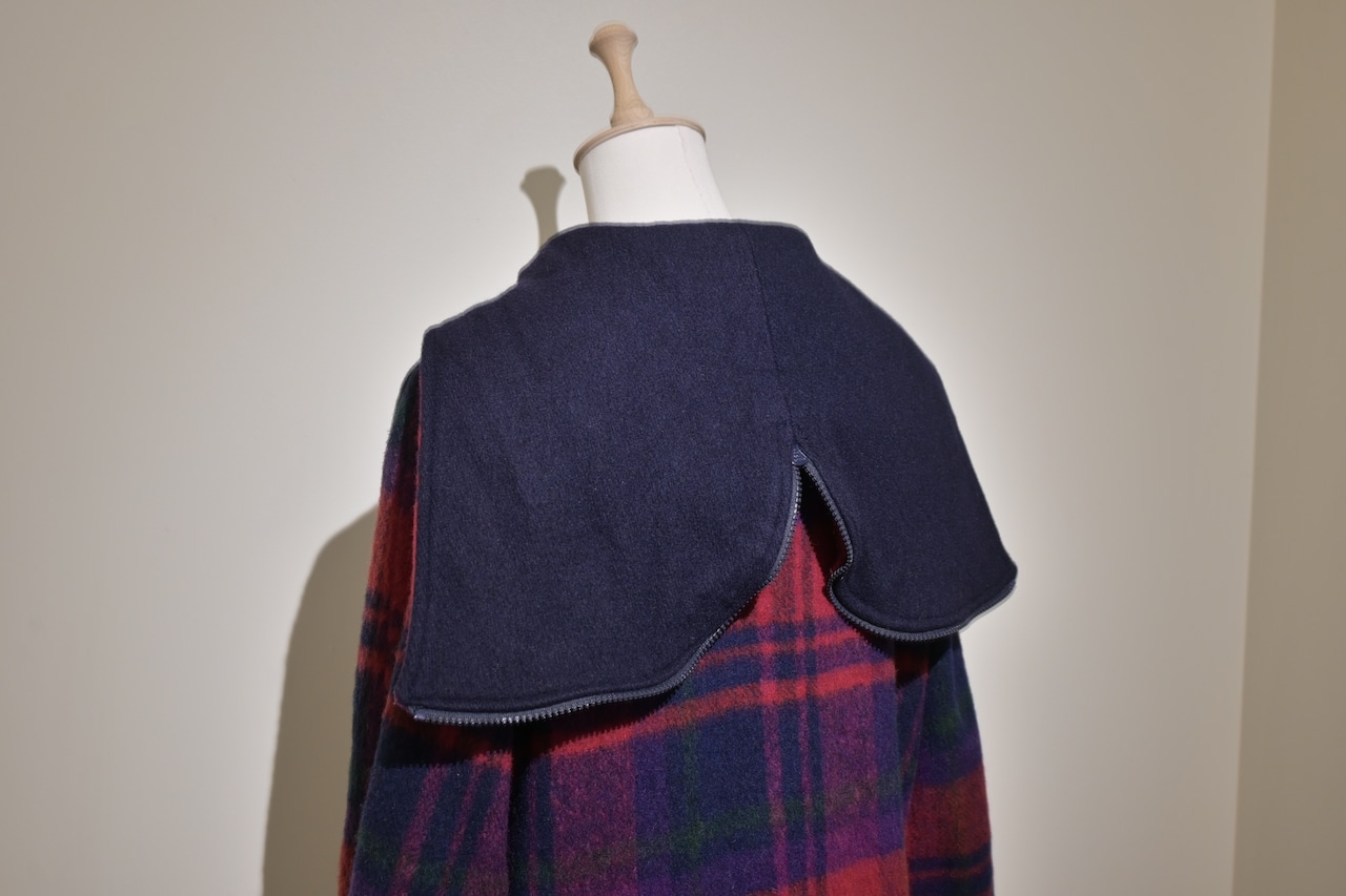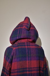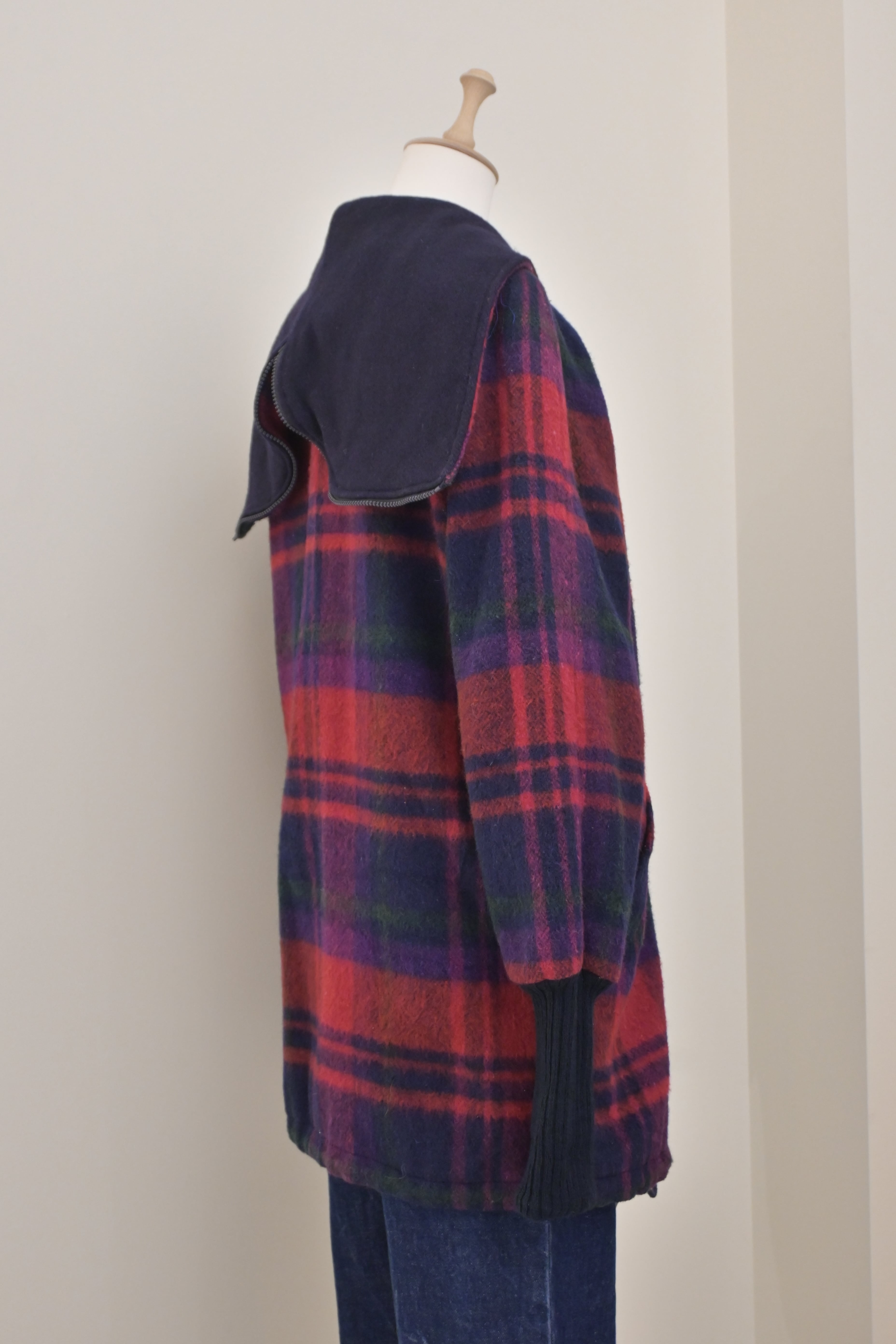 80's sailor collar plaid wool long rib jacket