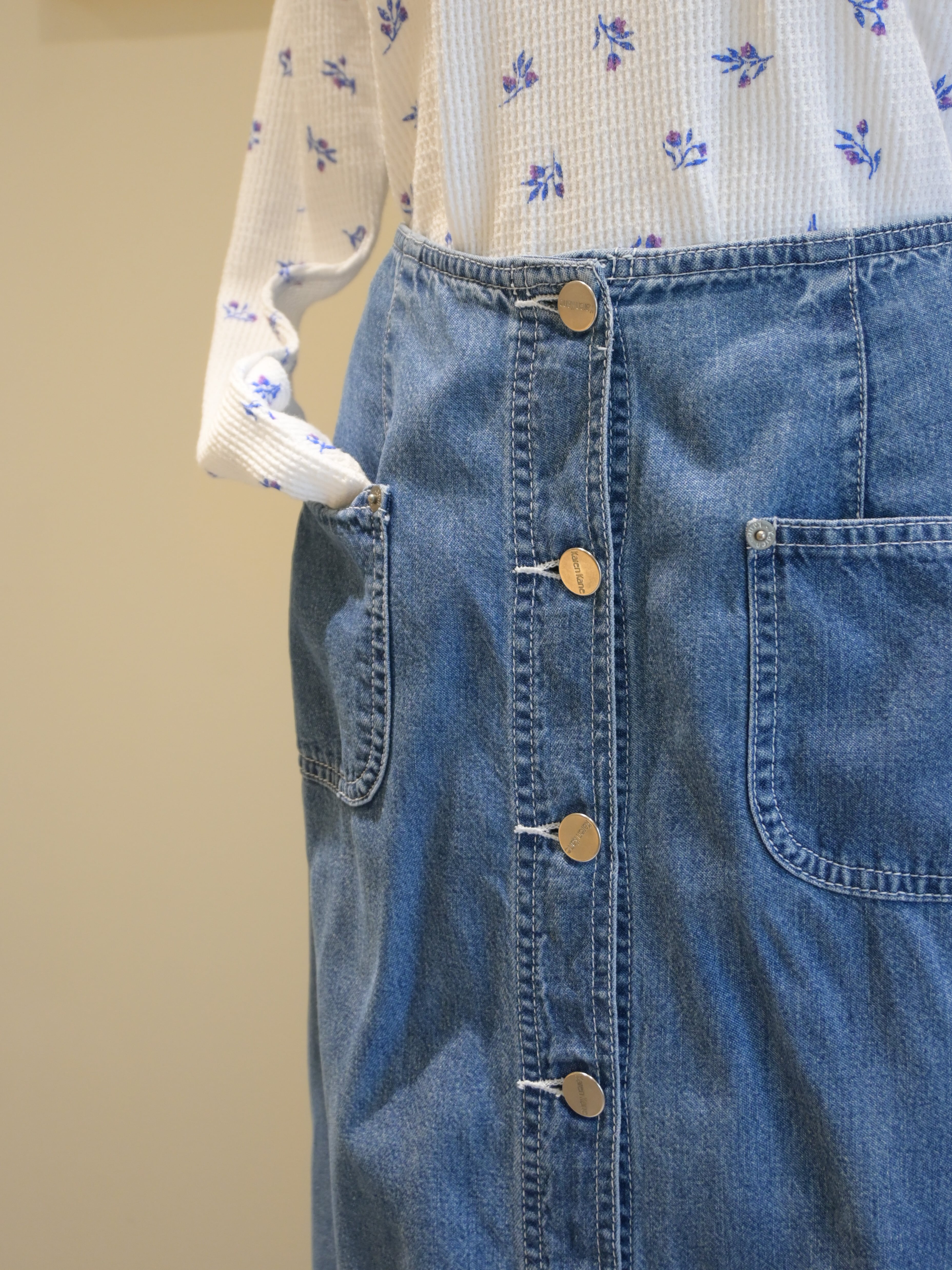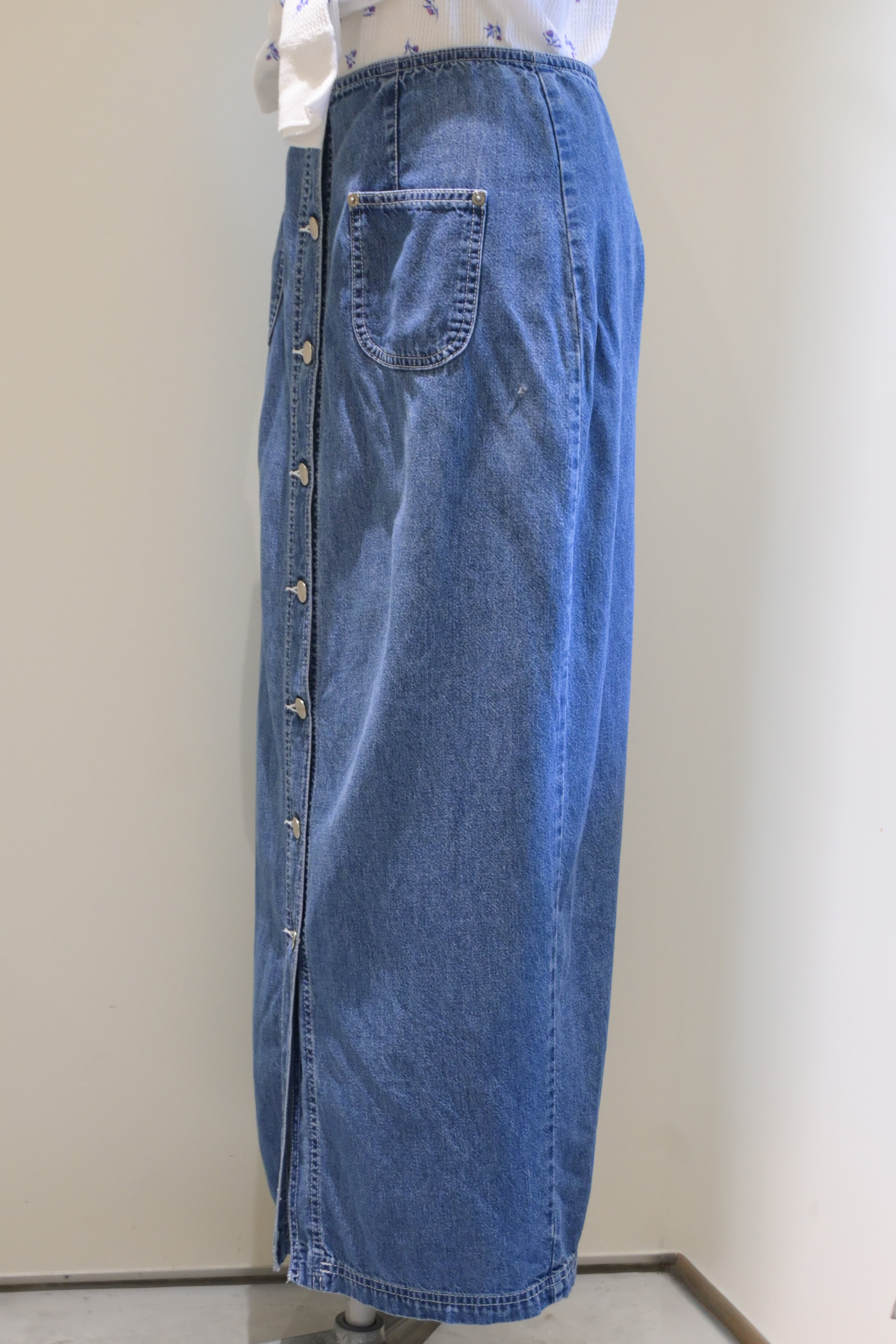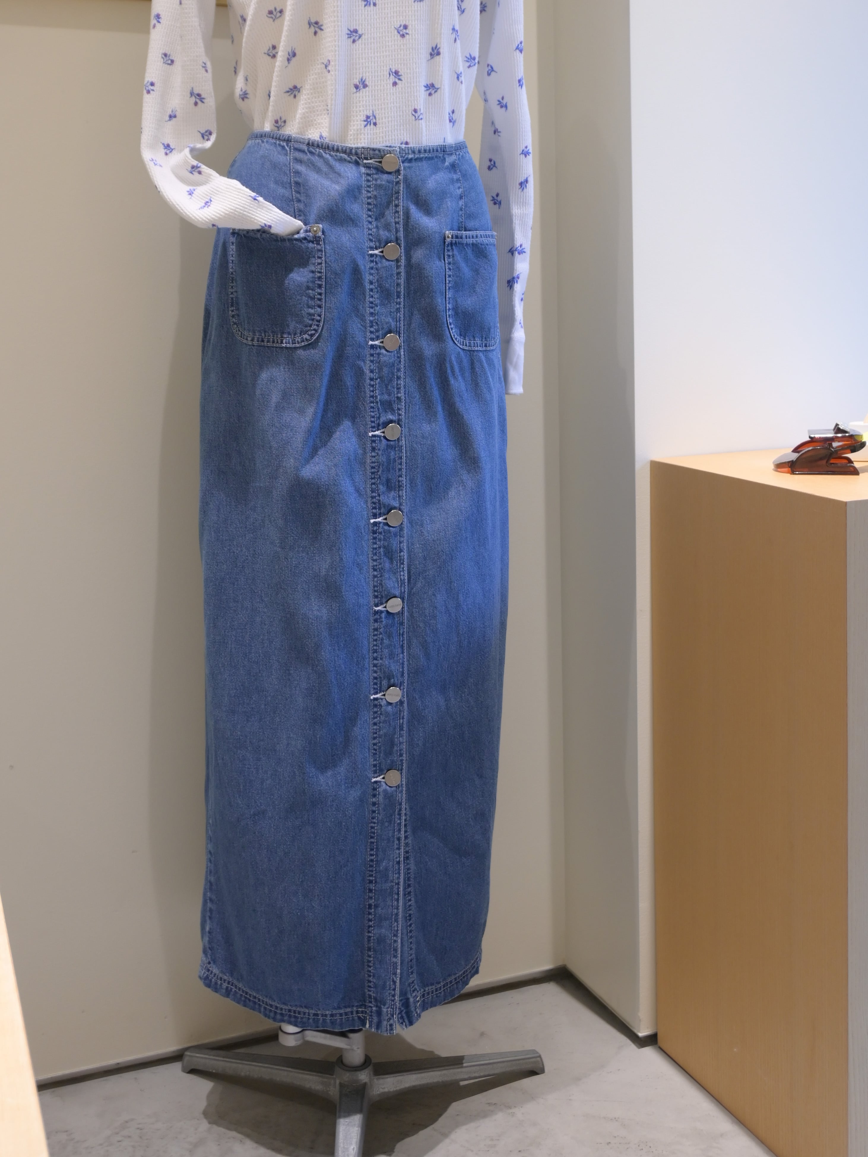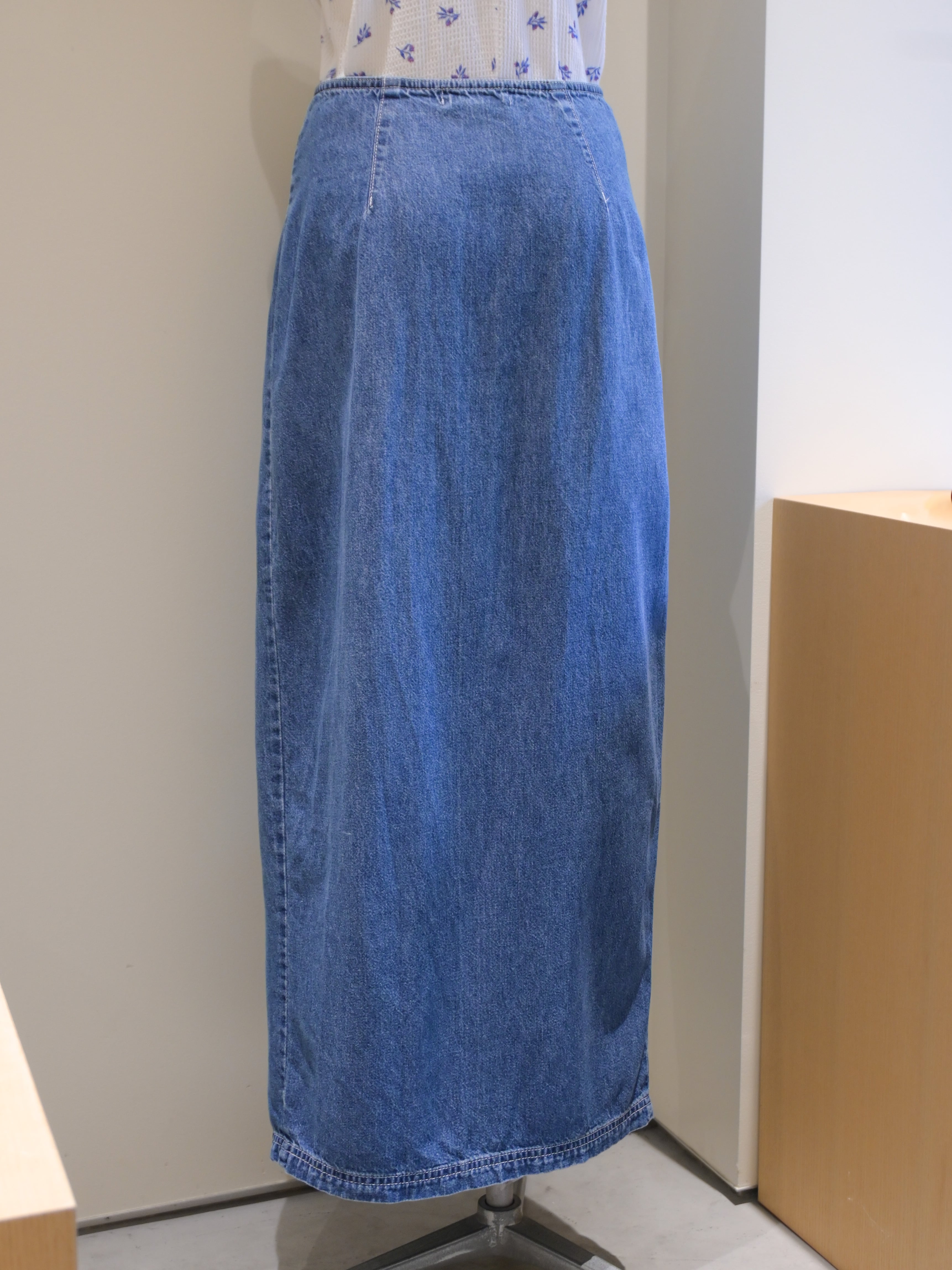 90's front open denim long skirt
